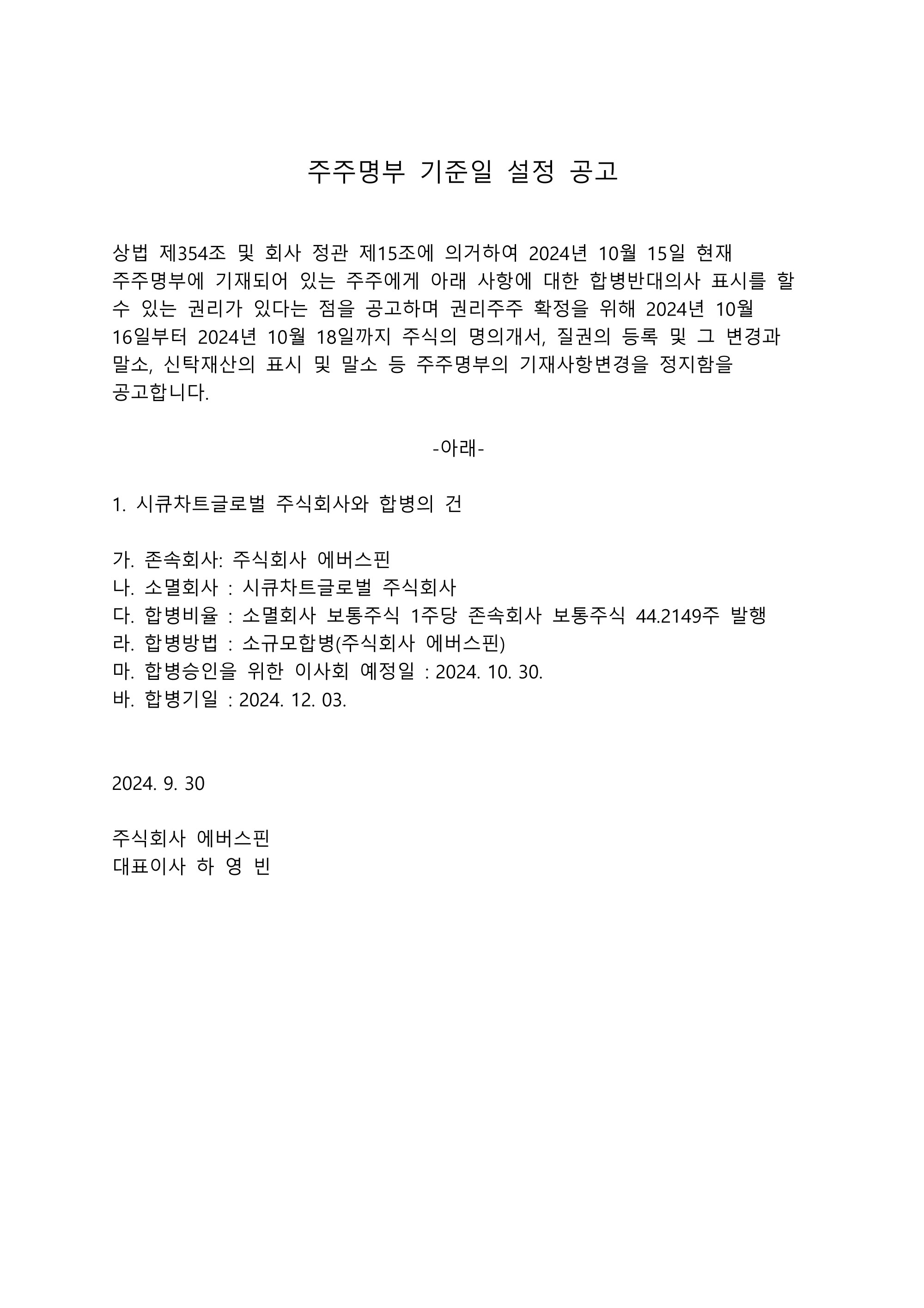 주주명부 기준일 설정 공고